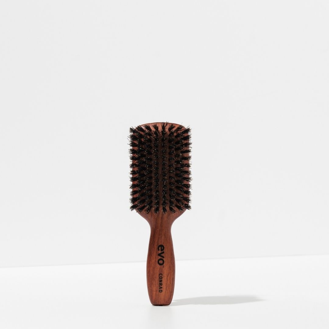 polish and smooth all hair types with conrad bristle paddle brush. this finishing brush features natural boar bristles which help to maintain the health and condition of hair. the unique structure of the boar bristle carries sebum from the scalp to the end of the hair shaft, coating each hair strand with natural oils. boar bristle brushing helps to repair dry hair and add shine. all evo hair brushes and combs are manufactured with an environmental conscience. each brush is made with fsc® certified wood from well-managed forests.