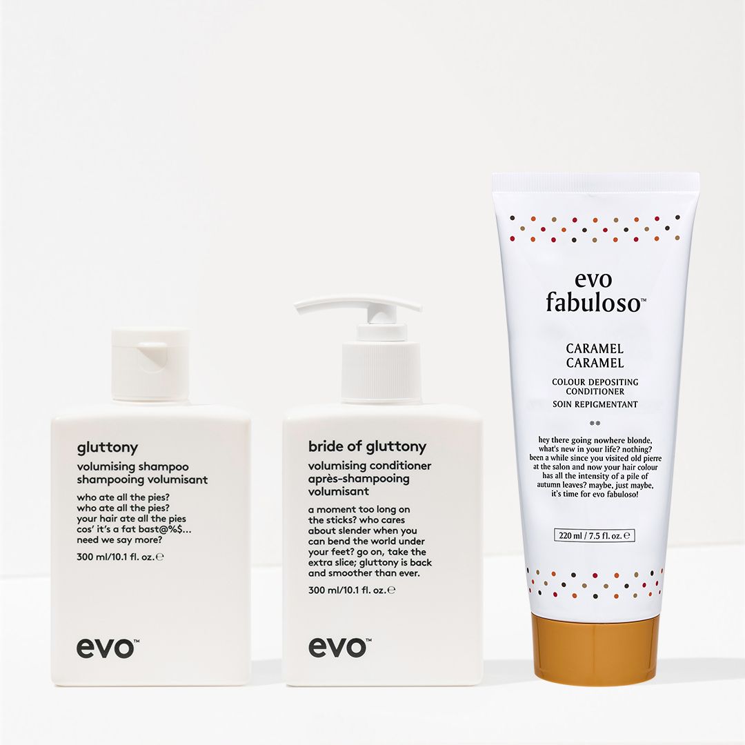 if you're ready to upgrade your color maintenance routine, grab this volumising shampoo, conditioner and caramel color depositing conditioner trio to cleanse, build body and strengthen, while refreshing and reviving color-treated hair.